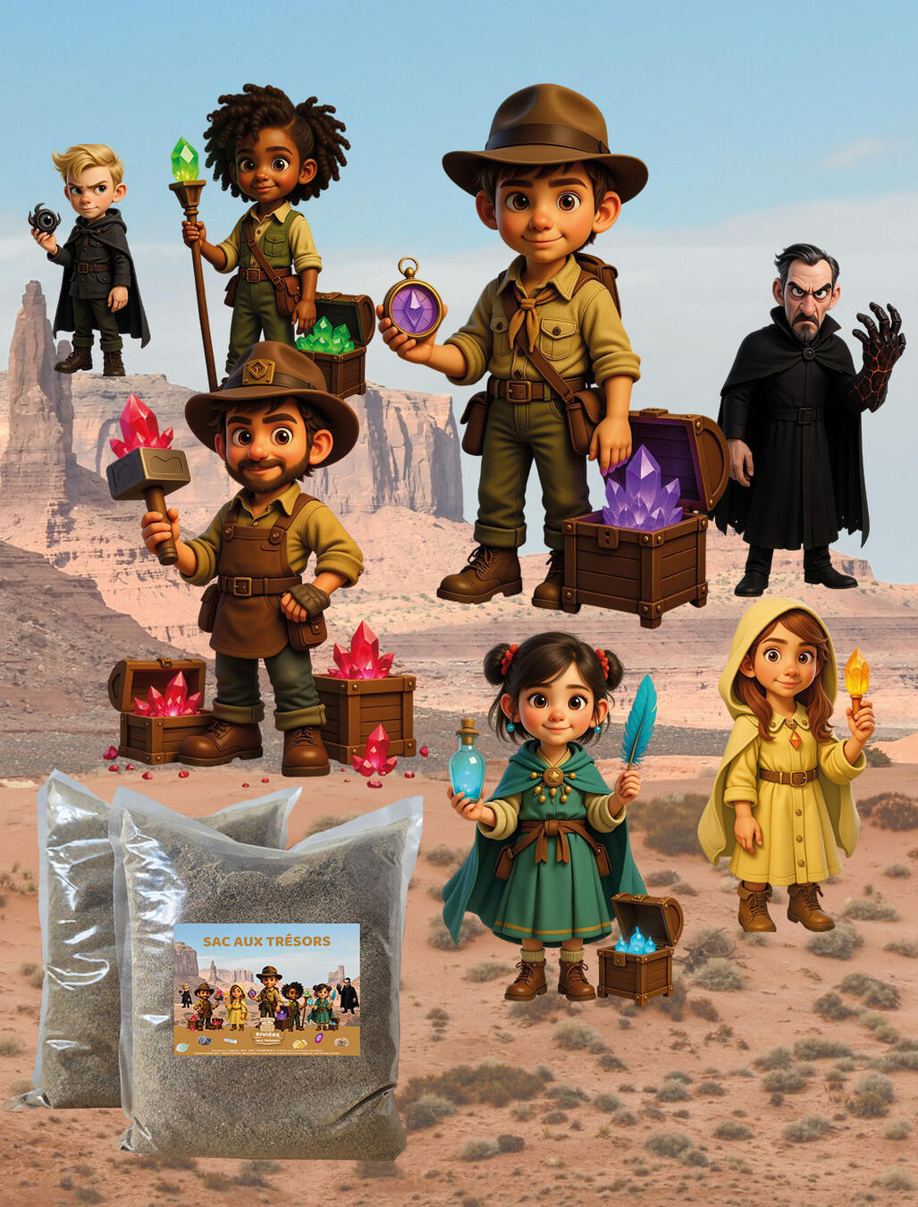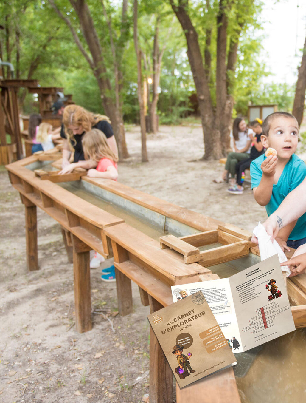 - Un décor immersif → rivière en bois, eau, tamis, sacs aux trésors, etc.